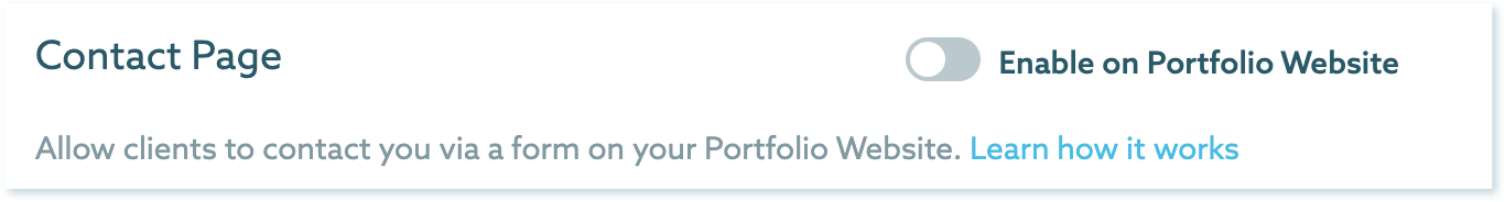 Optionally enable a Contact Form on your Portfolio Website, giving prospects an easy way to email you. When this option is enabled, visitors to your Portfolio Website will see a Contact tab, where prospects enter their name, email address, and message. Each time someone fills in the form, you'll receive an email at your brand email address.