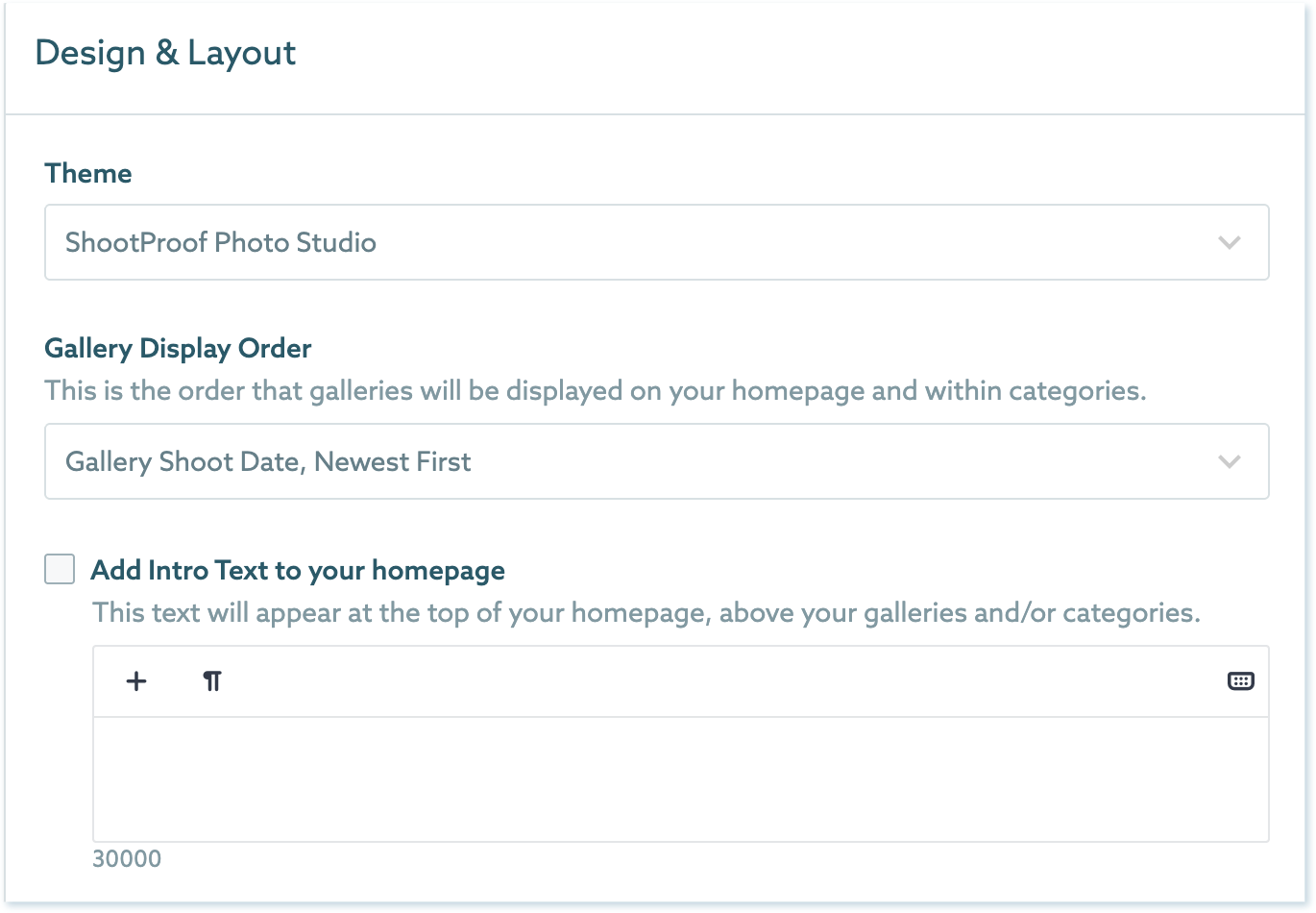 Optionally add text to your portfolio website. This text will appear at the top of the page, above your galleries.