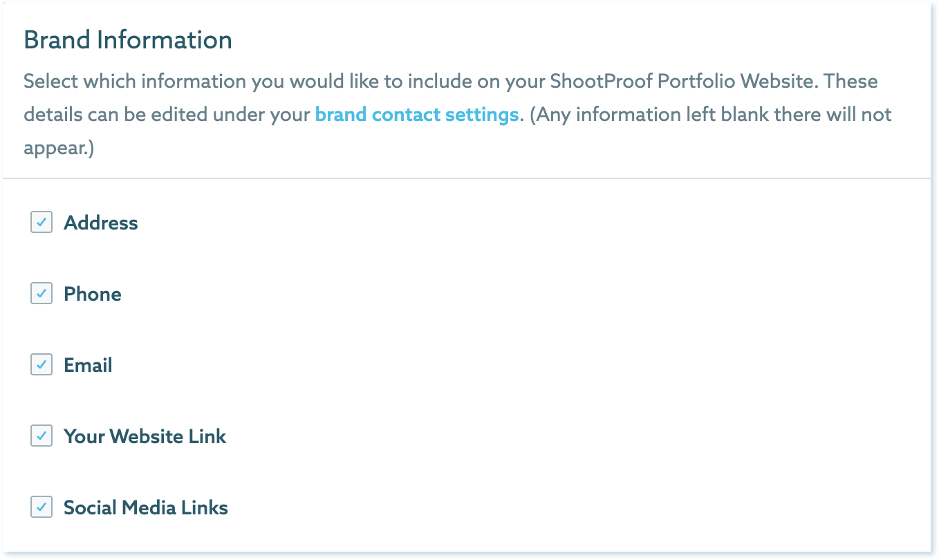 Select the information you would like to include on your ShootProof Portfolio Website. These details can be edited under your Brand Contact settings.