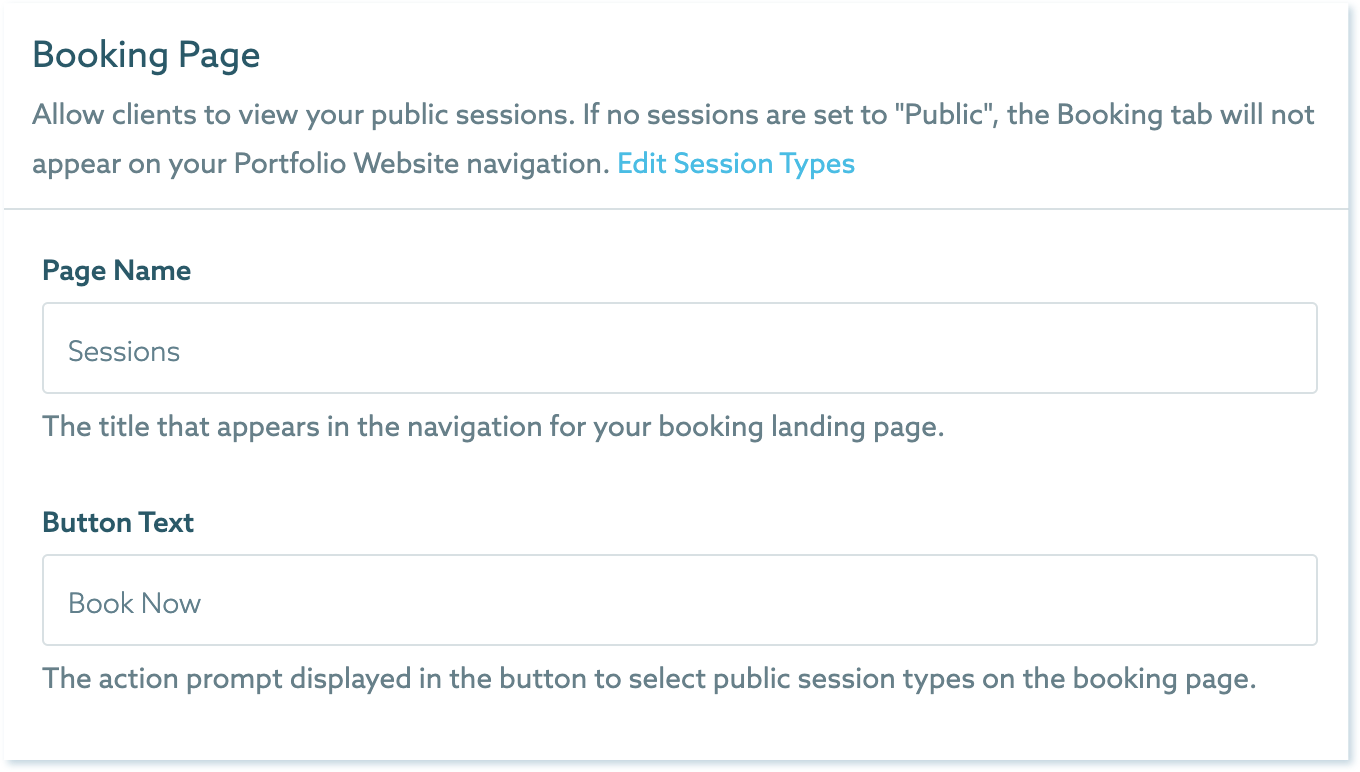 If you have a Booking plan and have session types that you have listed as Public, they will show on the Booking page of your Portfolio Website. Here you can choose the page name and set the text on the button that leads to the session's landing page.