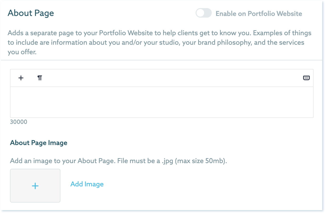 Enabling the About Page adds a new tab to your Portfolio Website. Here you may add information about yourself and your studio, your brand philosophy, and the services you offer. Use the keyboard icon to format your text. Optionally add an image to appear above the text. Your logo will already appear at the very top of your Portfolio Website, so you may want to add a different image here, such as an image of yourself or an example of your work.