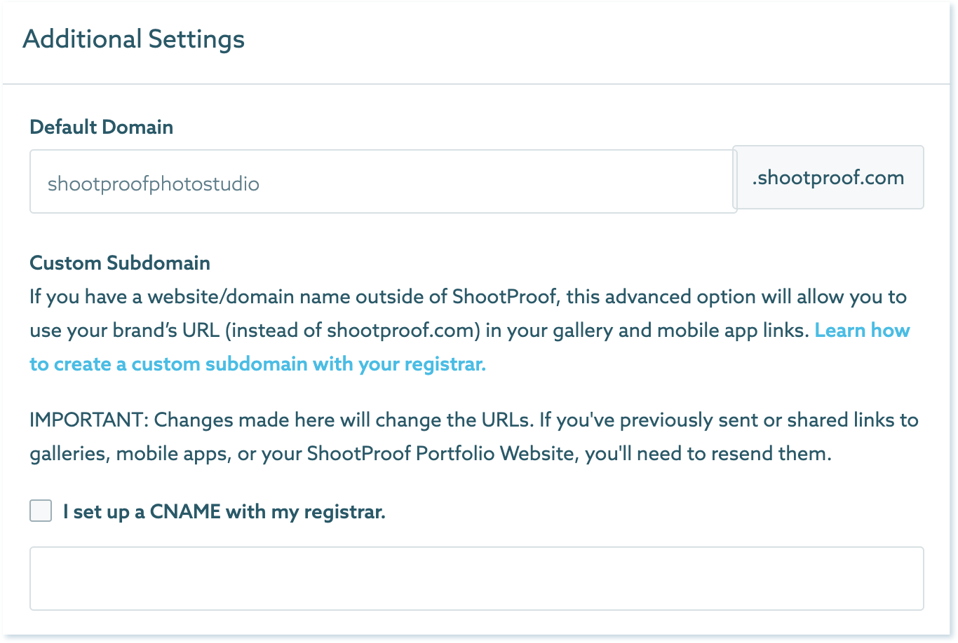 Your Default Domain is your brand name by default. The URL will be “yourbrandname.shootproof.com”. You can enter a different default domain, but be aware that changing the domain name will break any gallery links you've previously sent to clients. If you change the domain, you'll need to resend all previously shared links.