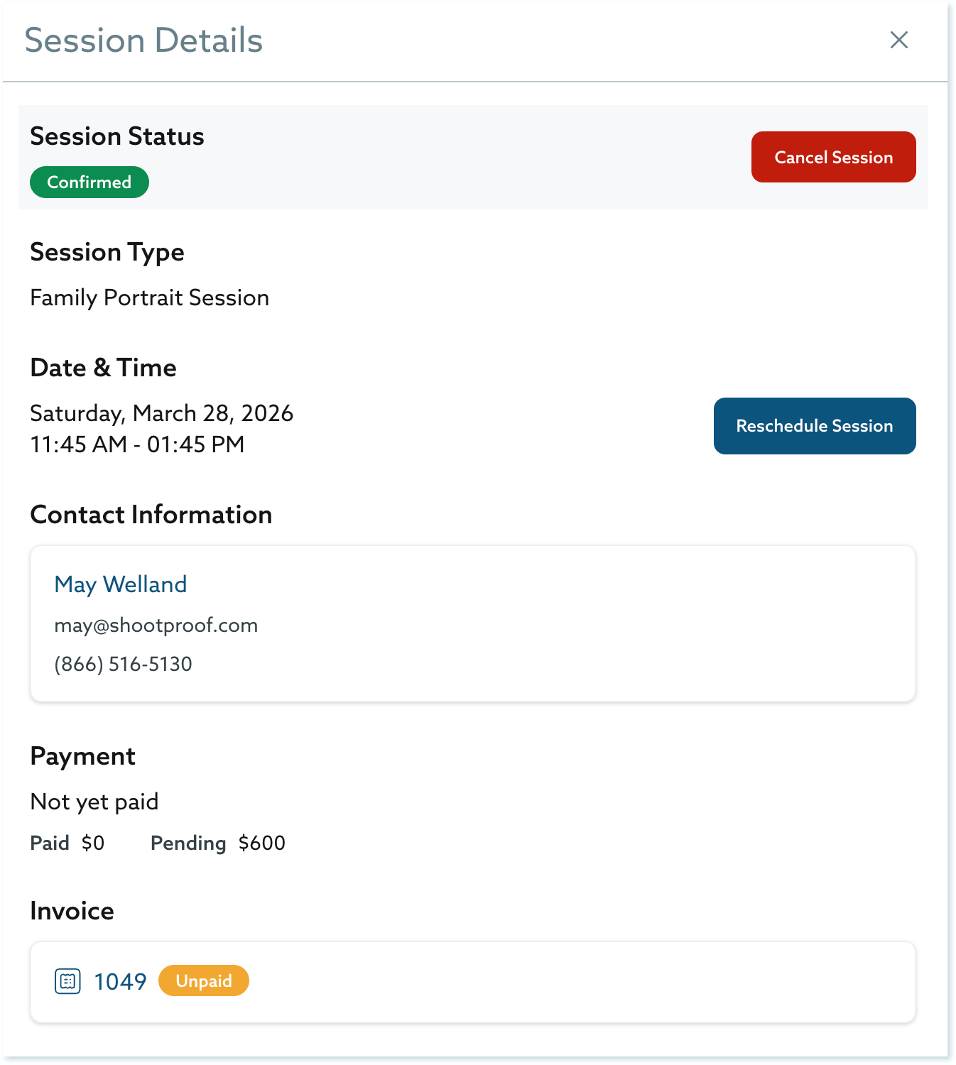 Here you'll see your client's information, the shoot location, the payment status of their invoice, and the confirmation status.
