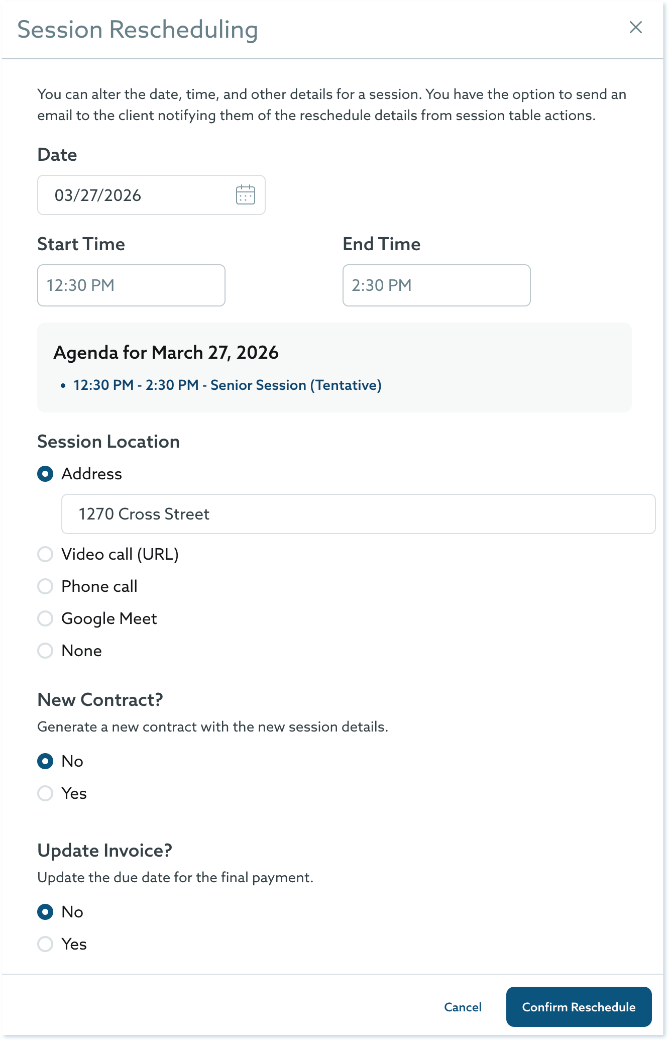To reschedule a session, click into the Session Details and select Reschedule Session. Here you can change the date and time of the session, the session length, and location. If the session has a contract or invoice attached it, you will have the option to issue a new contract and change the final due date of the invoice.