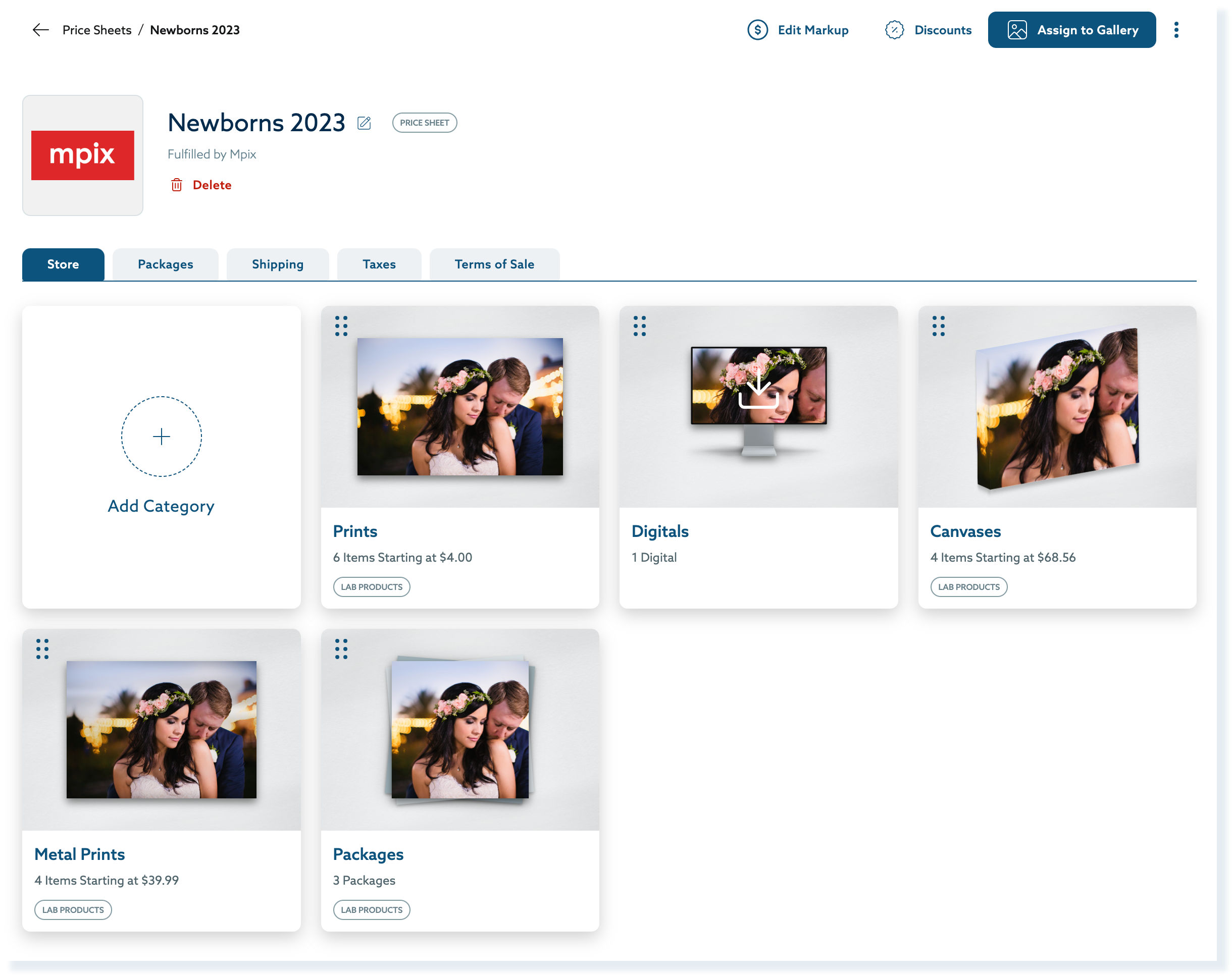 Within your price sheet, items will be organized into categories that your client will see when they click Buy Photo in their gallery. Each price sheet will automatically have 6 categories in it: