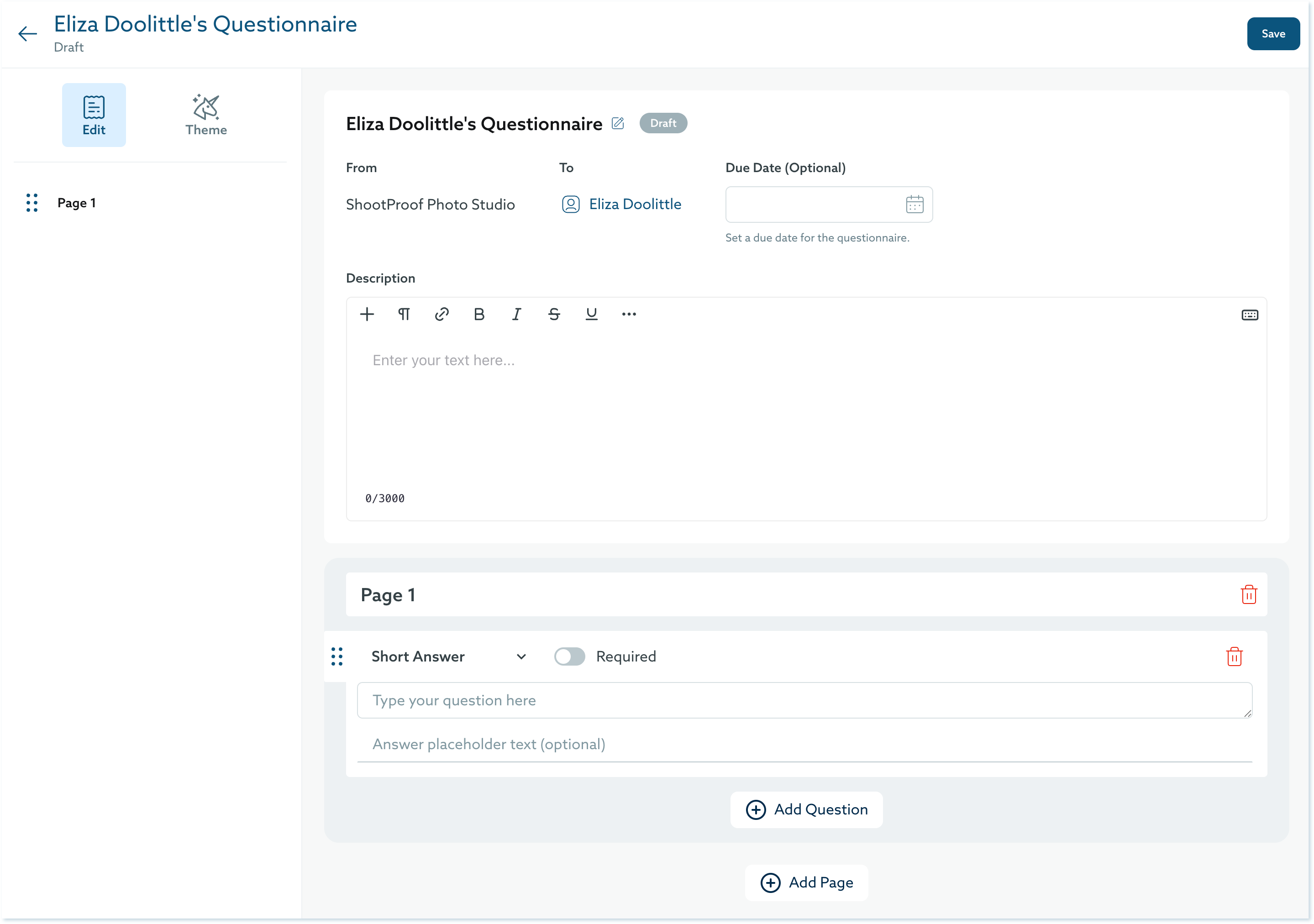 Questionnaires are a great way to get information from your client without all the back and forth emails. If you already have questions that you commonly ask clients or have an existing questionnaire outside of ShootProof, make it into a questionnaire template to be used over and over.